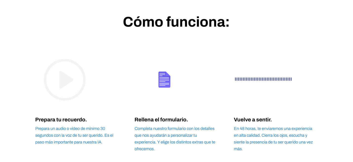 Somos una marca que se encarga de crear nuevos recuerdos con la ayuda de la tecnología, para ofrecer una experiencia que llegue al alma y perdure en el corazón de los personas. Estamos comprometidos a priorizar la privacidad, ética y moralidad en cada fase de nuestros procesos. En ReCuerdo.Ai las voces perdidas encuentran un nuevo comienzo.